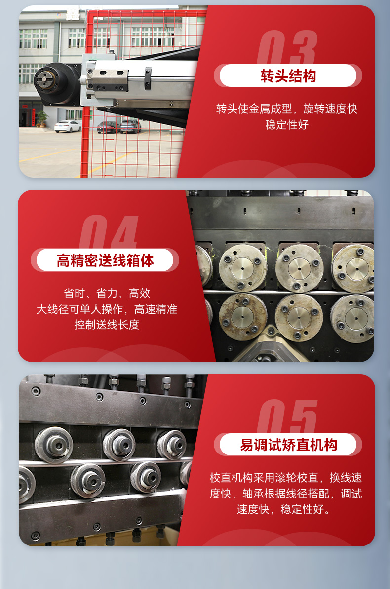 產(chǎn)品特點(diǎn):適用于生產(chǎn)汽車零部件、汽車門(mén)鎖拉桿、工藝品金屬線、廚具餐具支架、倉(cāng)儲(chǔ)籠、超市貨架、手推車等線材成型產(chǎn)品;轉(zhuǎn)頭與送線完全分離,真正可實(shí)現(xiàn)轉(zhuǎn)頭時(shí)不轉(zhuǎn)線,確保送線靈活而且穩(wěn)定性高。
