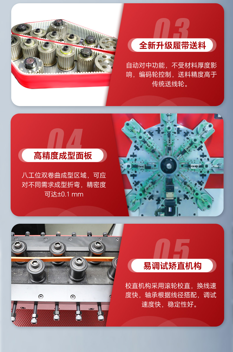 2、設(shè)備采用履帶送料,代替?zhèn)鹘y(tǒng)送線輪,不同線徑無需更換送線輪。履帶送料,具備自動對中功能,不受材料厚度