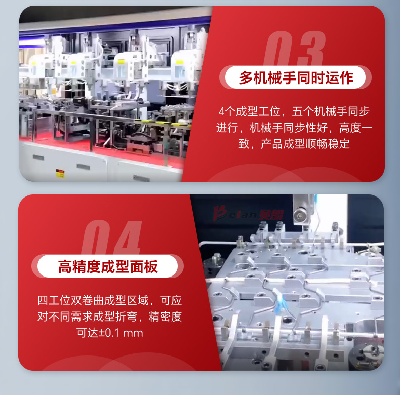 2、設(shè)備由35~58個伺服及部分氣動多工位折彎成型可根據(jù)產(chǎn)品尺寸任意調(diào)整數(shù)據(jù),單個工位可同時折彎多個角。